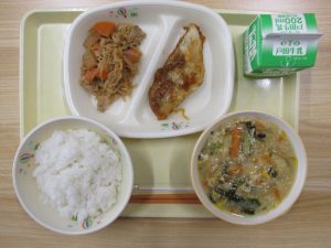 ごはん、白身魚のピリ辛ソース、切干大根の煮物、かき玉スープ、牛乳