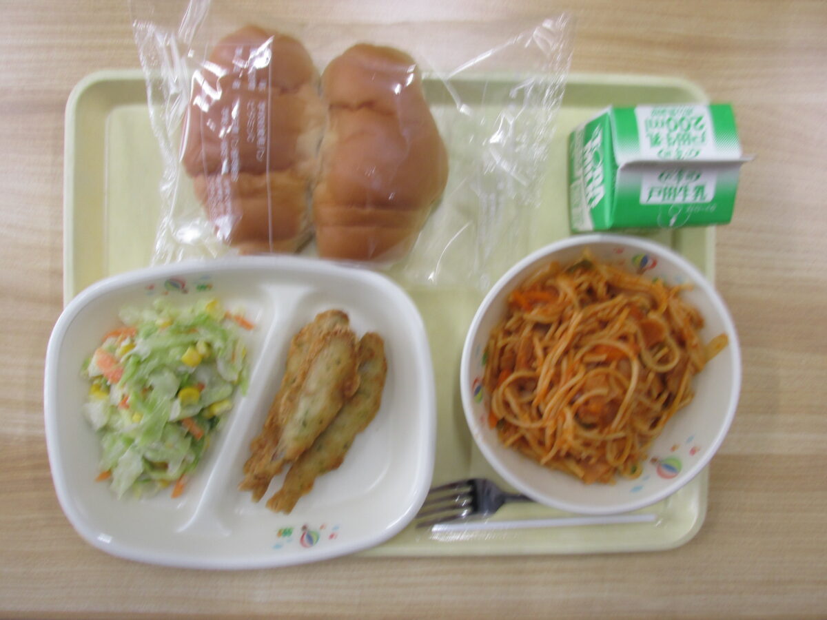 バターロール、スパゲティナポリタン、わかさぎフリッター、コールスローサラダ、牛乳