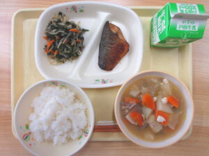 ごはん、さばのソース煮、磯香あえ、豚汁、牛乳