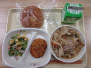 ライスボール、おっきりこみ、ゼリーフライ(ソース)、ブロッコリーのごまドレサラダ、牛乳