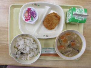 しゃくし菜ごはん、深谷ねぎメンチカツ、きのこけんちん汁、ワインゼリー、牛乳