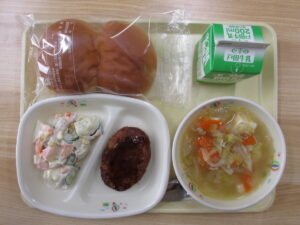 はちみつパン、照り焼きハンバーグ、ポテトサラダ、野菜と豆腐のスープ、牛乳