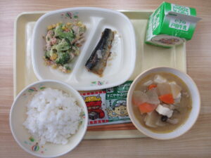 ごはん、のりふりかけ、いわしのみぞれ煮、ブロッコリーのごまマヨあえ、みそけんちん汁、福豆、牛乳
