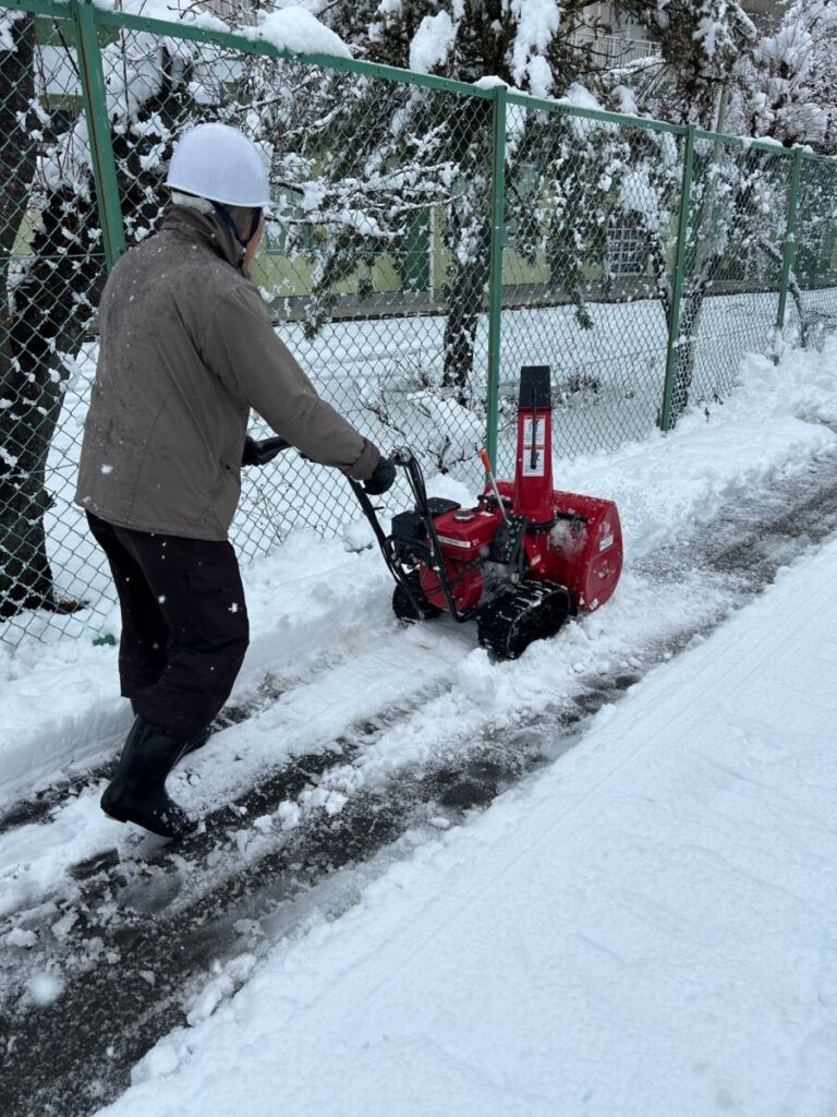 秩父地方では、積雪が最大27cmを観測する大雪となりました。生徒は2時間遅れの対応を取りましたが、生徒の安全確保のため職員が総出で雪かきをしました。そのような中、平成27年度の卒業生からいただいた卒業記念品(除雪機)が大活躍しました。
