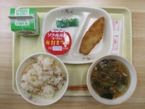 たけのこごはん、白身フライ(ソース)、沢煮椀、ヨーグルト、牛乳