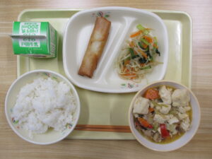 ごはん、豆腐のうま煮、春巻き、もやしサラダ、牛乳