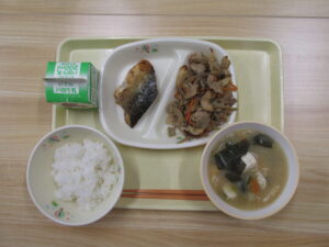 ごはん、みそ汁、鯖の生姜焼き、五目きんぴら、牛乳