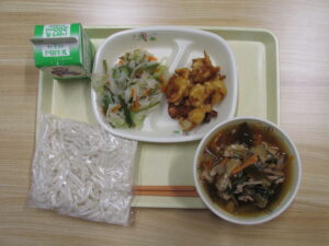 地粉うどん、五目うどん、みそポテト、切干大根のサラダ、牛乳
