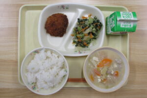 ごはん、スタミナスープ、ソースカツ、ごまあえ、牛乳