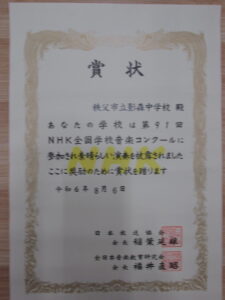 夏休みの期間中に、コーラス部が2つのコンクールに出場しました。8月6日には、NHK学校音楽コンクール埼玉県コンクールに出場し奨励賞を受賞しました。8月25日には、埼玉県合唱コンクールに出場し優良賞を受賞しました。さらに、優良賞の中でも最上位に当たる奨励賞も受賞しました。少ない部員数の中で、素晴らしいパフォーマンスを披露したコーラス部の皆さんに心から敬意を表します。