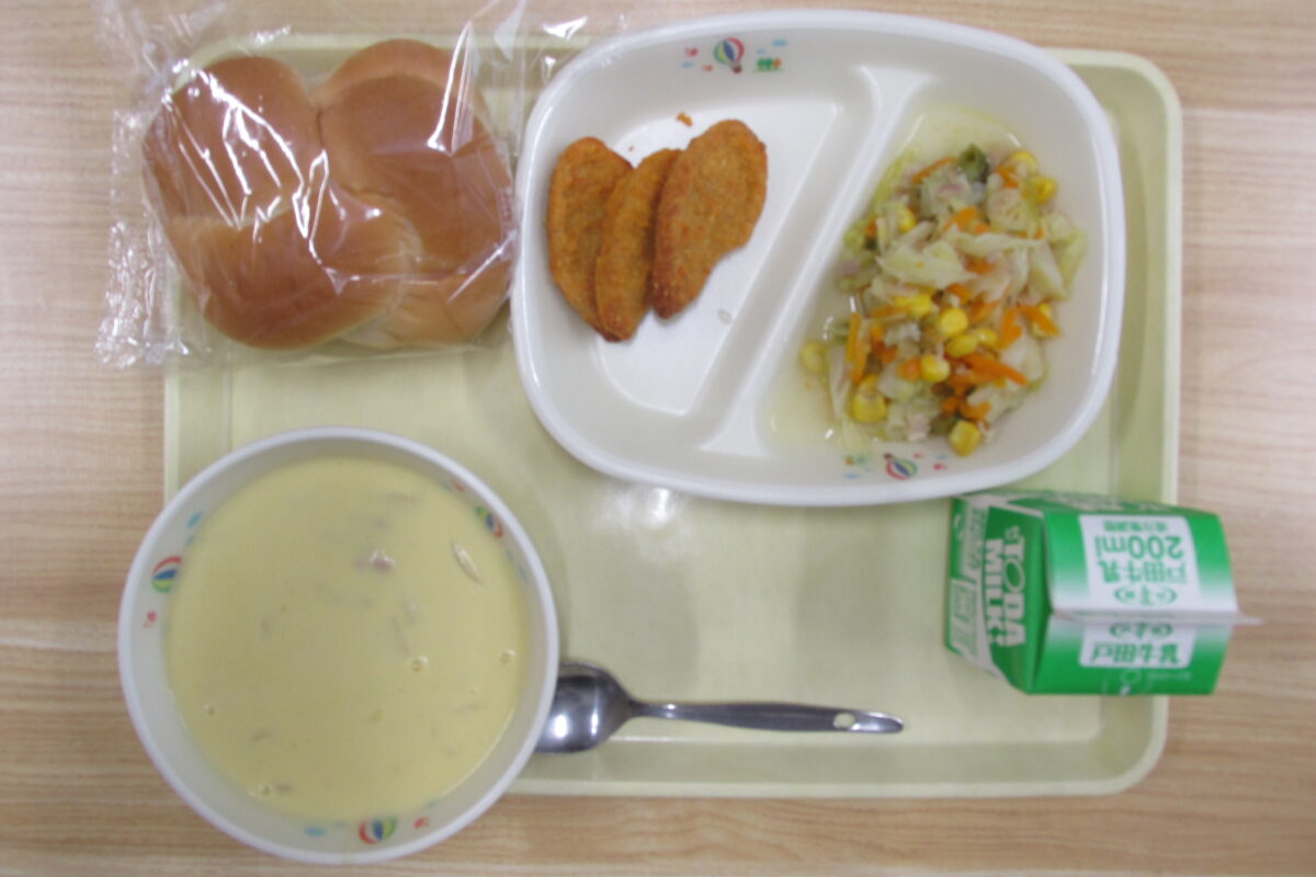 フラワーロール、コーンポタージュ、チキンナゲット、キャベツのペペロンチーノ、牛乳