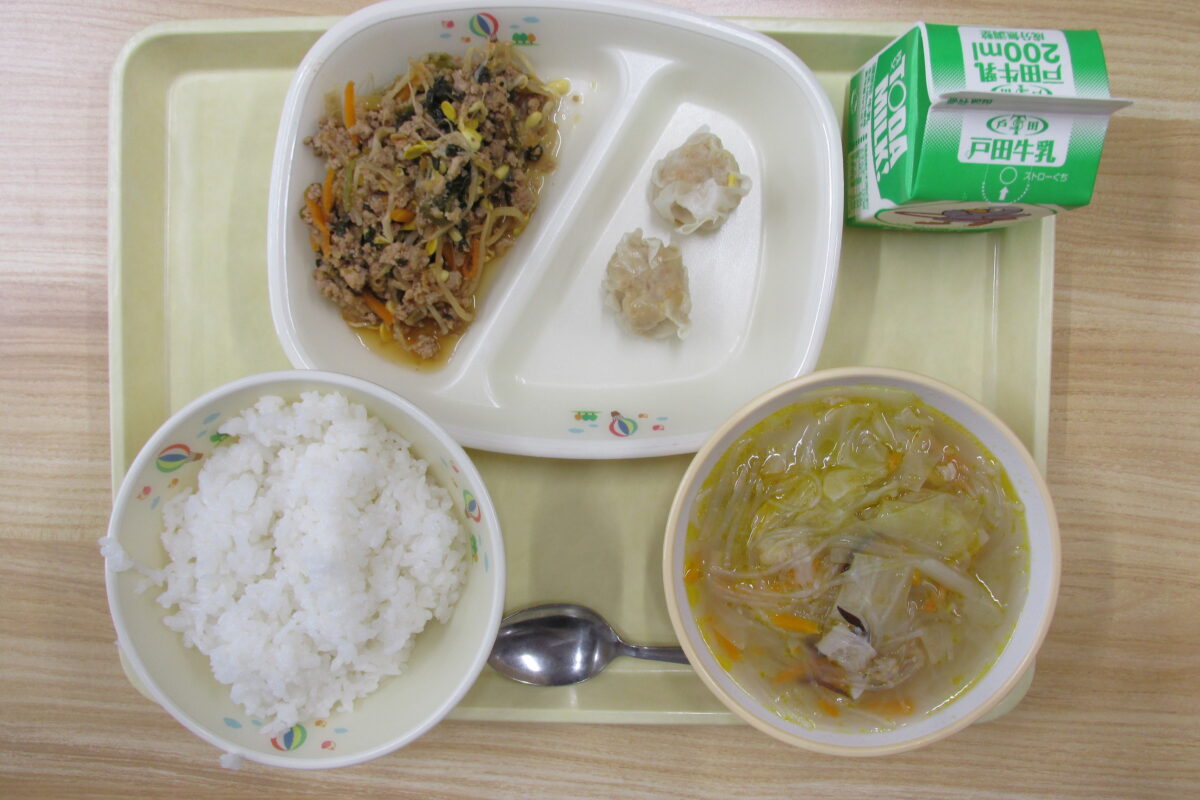ごはん、ビビンバの具、春雨スープ、コーン焼売、牛乳