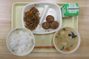 ごはん、かきたま汁、白ごまつくね、五目きんぴら、牛乳