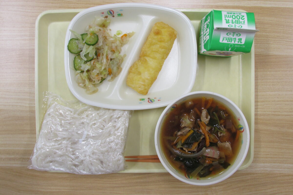 地粉うどん、肉うどん、いかの天ぷら、たくあんあえ、牛乳