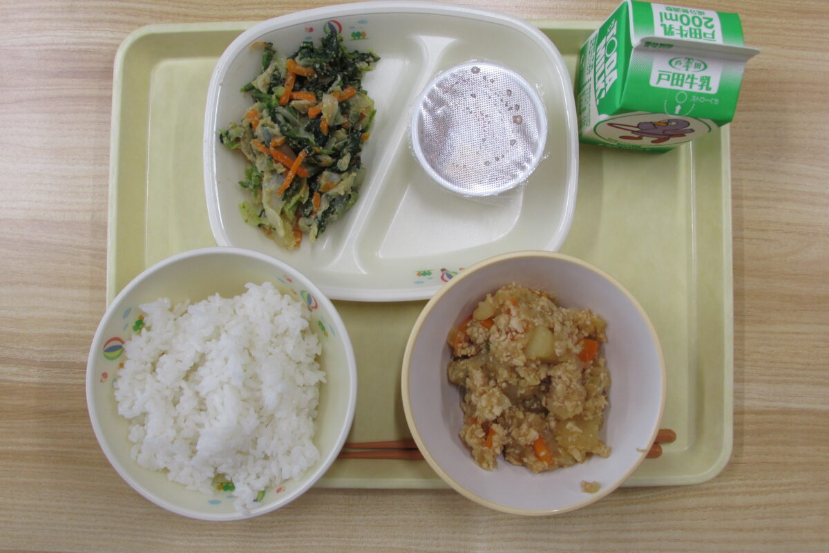ごはん、じゃがいものそぼろ煮、納豆、ごまあえ、牛乳
