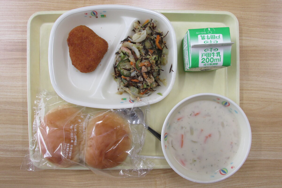 はちみつパン、白花豆のポタージュ、焼き栗コロッケ、ツナとひじきのサラダ、牛乳