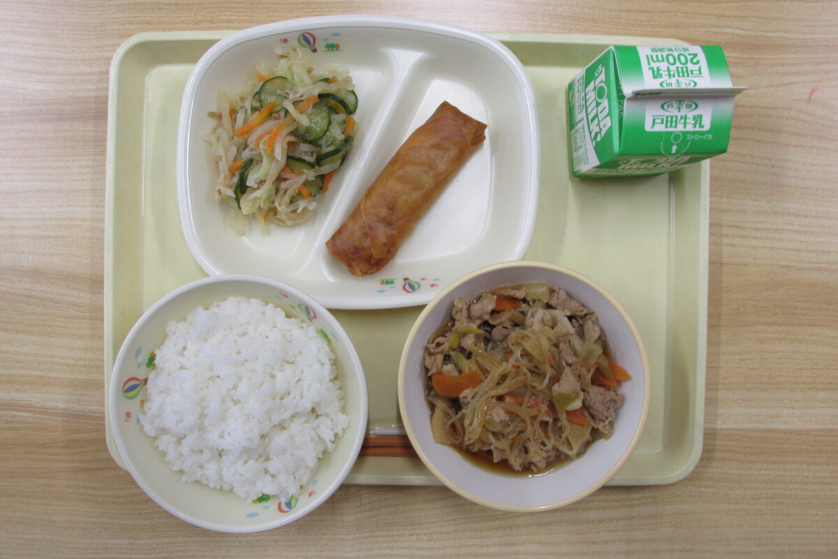 ごはん、肉丼の具、春巻き、切干大根のサラダ、牛乳
