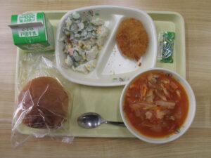 子どもパンすらいす、ミネストローネ、エビカツ(パックソース)、ポテトサラダ、牛乳