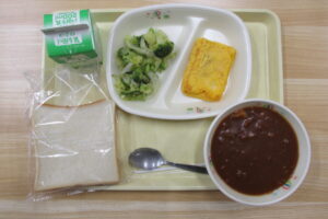 厚切り食パン、ブラウンシチュー、ハムチーズピカタ、グリーンサラダ、牛乳