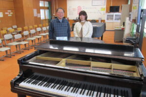 久喜市高齢者大学の音楽クラブの方(埼玉県久喜市在住)が「旅立ちの日に」が作られた当時のピアノを見たいということで、本校を訪問されました。