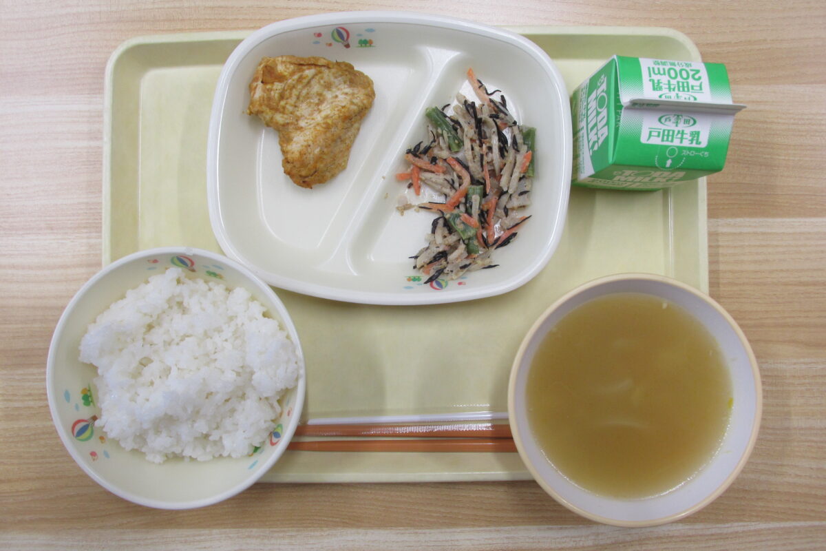 ごはん、ABCスープ、タンドリーチキン、ごぼうサラダ、牛乳