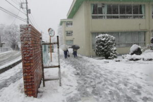 歩道に雪が積もり、足下の悪い中でしたが、生徒は元気の登校しました。