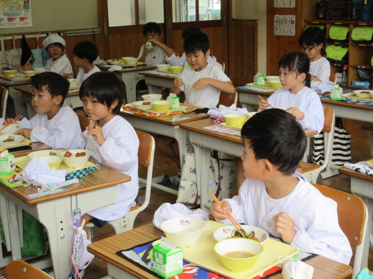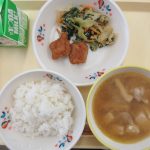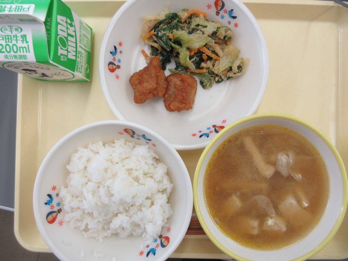 今日の給食は、ご飯 牛乳 若鶏の唐揚げ トン汁 ごま和え です。
