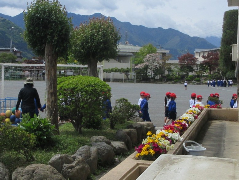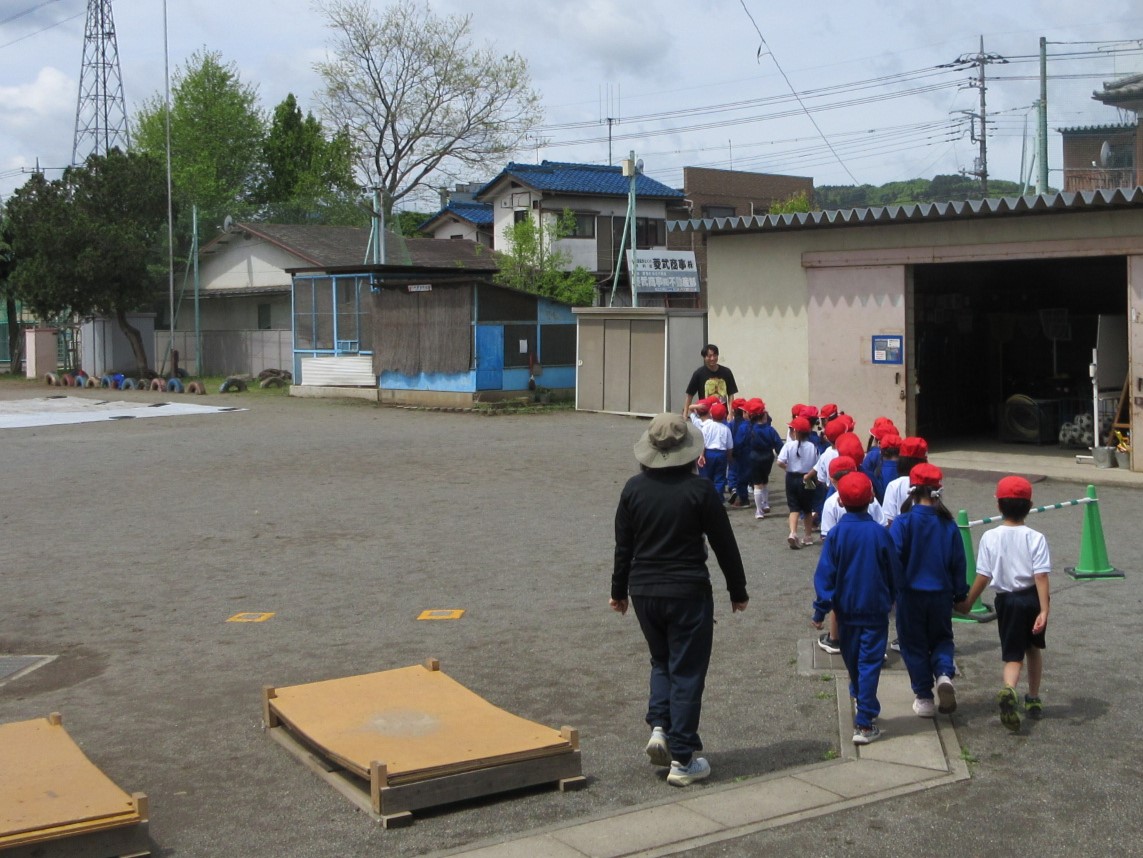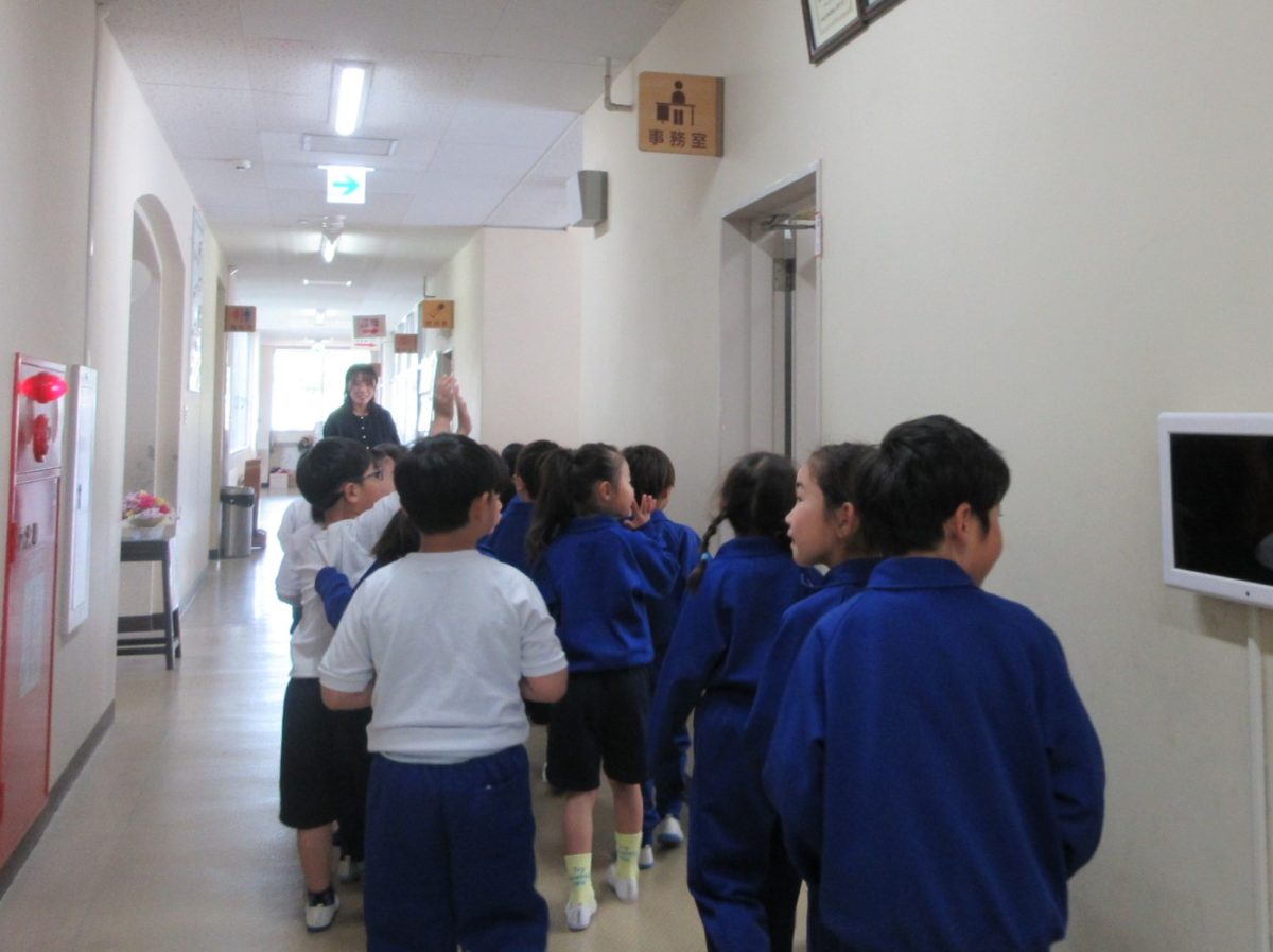 今日は1年生が学校の中や外を探検していました。学校の中では、校長室や職員室などだけでなく、階段をあがって2階以上の教室などを知りました。学校の外では、大校庭や遊具なども知りました。