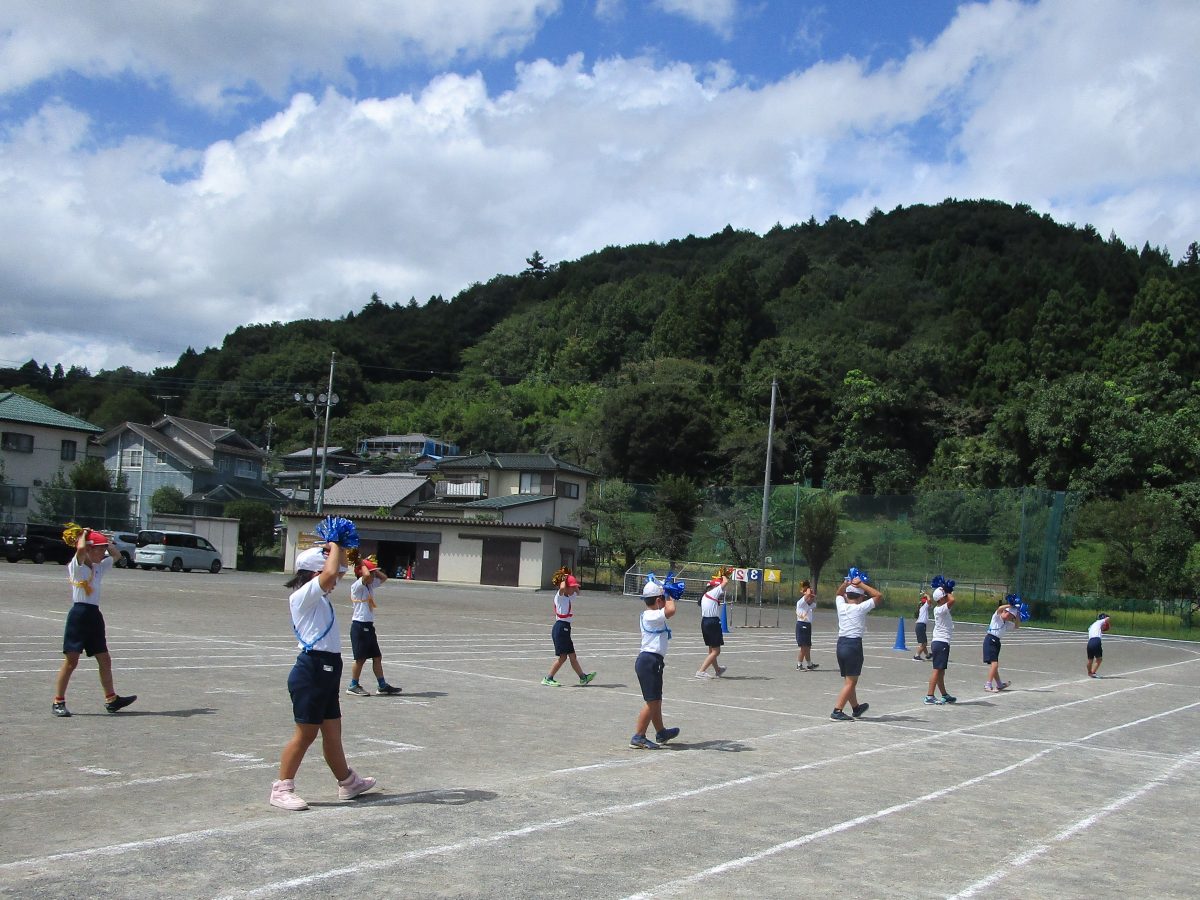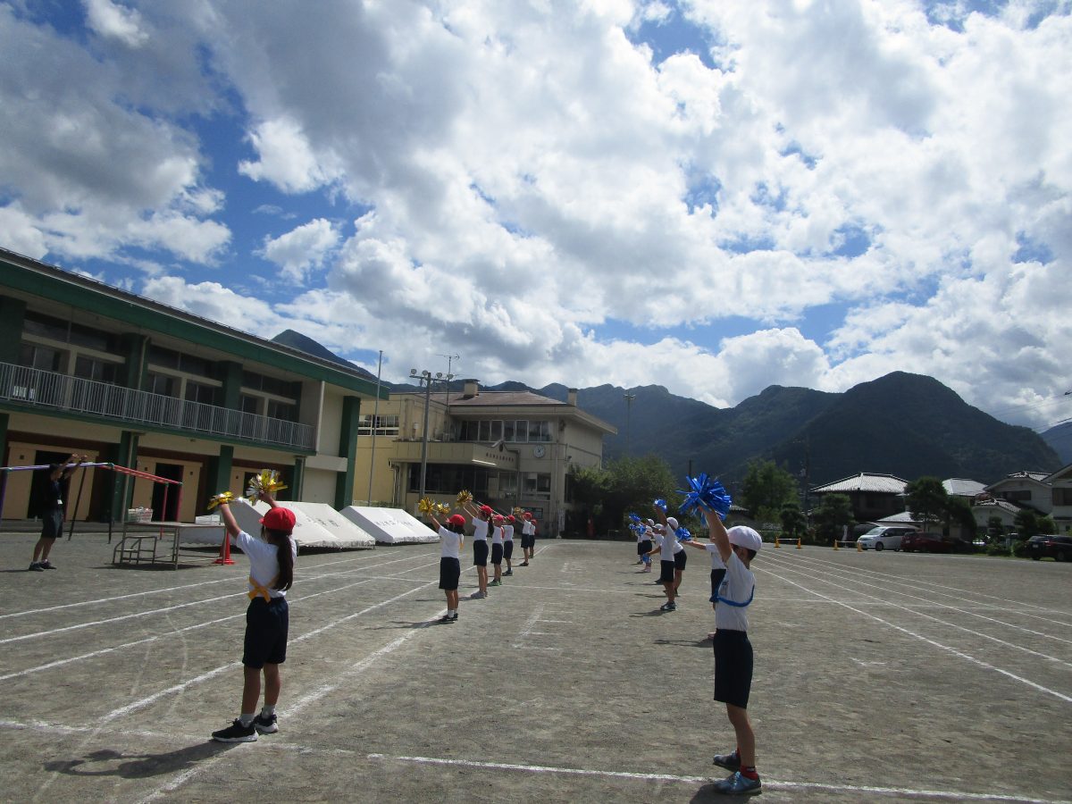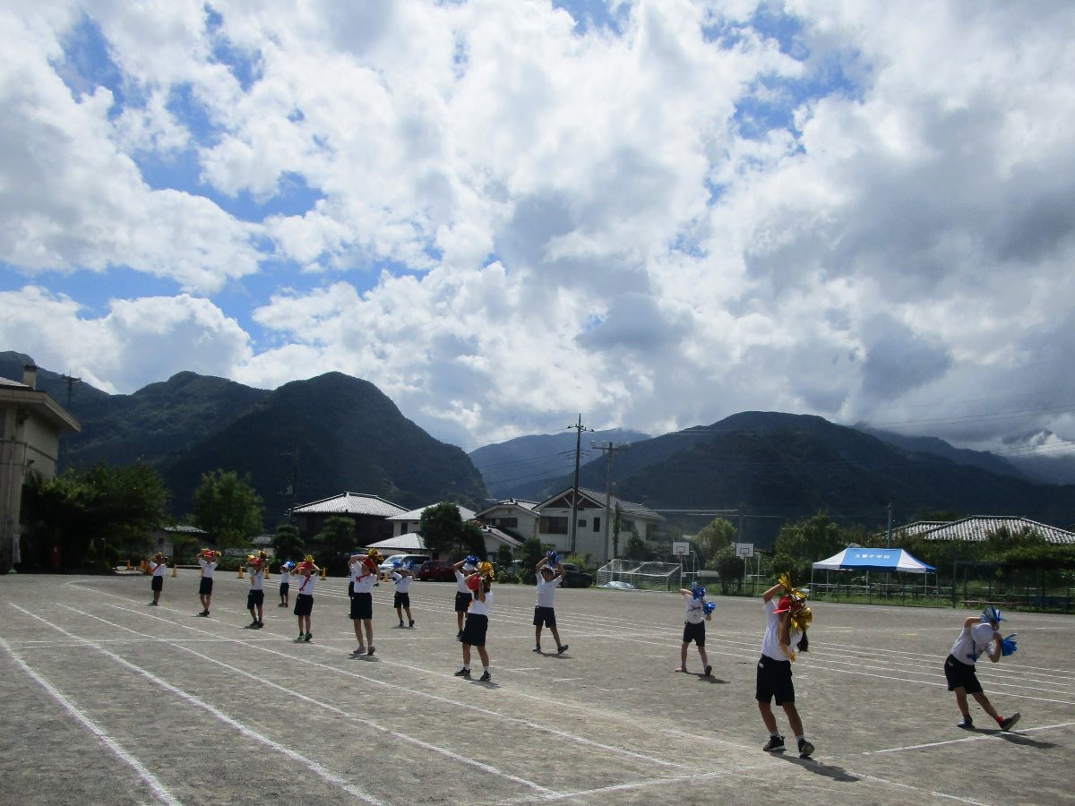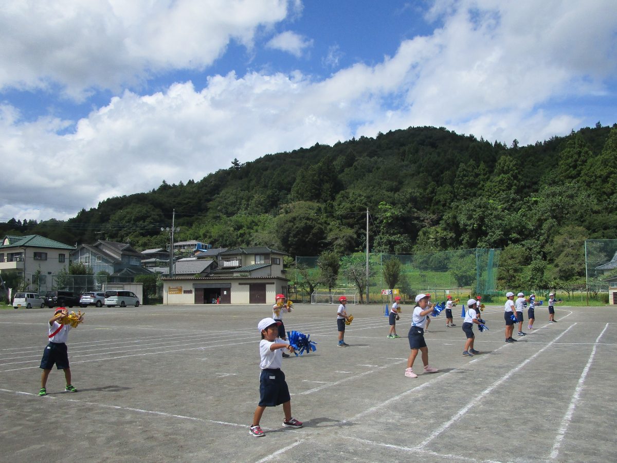 9月12日(火)、今日は1~3年生が校庭でポンポンを付けて表現・ダンスの練習を行いました。日が差すと、スポットライトがアイドルを照らすように見えます。「久那小にサチアレ!14人のアイドル♡」は9月16日(土)11:05演技予定です。