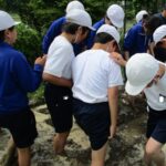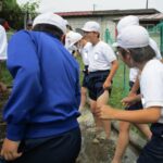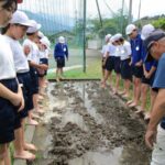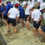 令和7年5月23日(金)、今日は5・6年生が米づくりをするために足で代掻きをしました。ミニ田んぼの泥をしっかりと足で踏み、柔らかくしていきます。米づくりには大切な作業です。「米」は「八十八」という数字があるように、八十八の手間がかかっています。これからも体験しながら学んでほしいです。