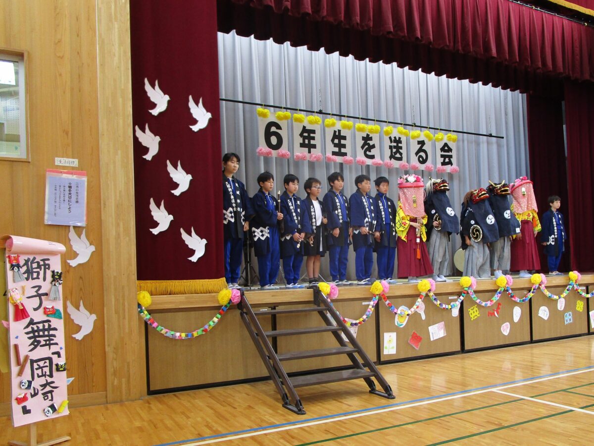 令和8年2月27日(金)、今日は6年生を送る会を行いました。3・4年生は5年生にもリコーダーの協力も得て、力強く堂々と獅子舞を披露し、6年生にエールを送りました。1・2年生は魔法の学校をモチーフに楽しさと可愛らしさ溢れる表現からしっかりと気持ちが伝わるメッセージを6年生に送りました。
