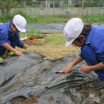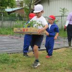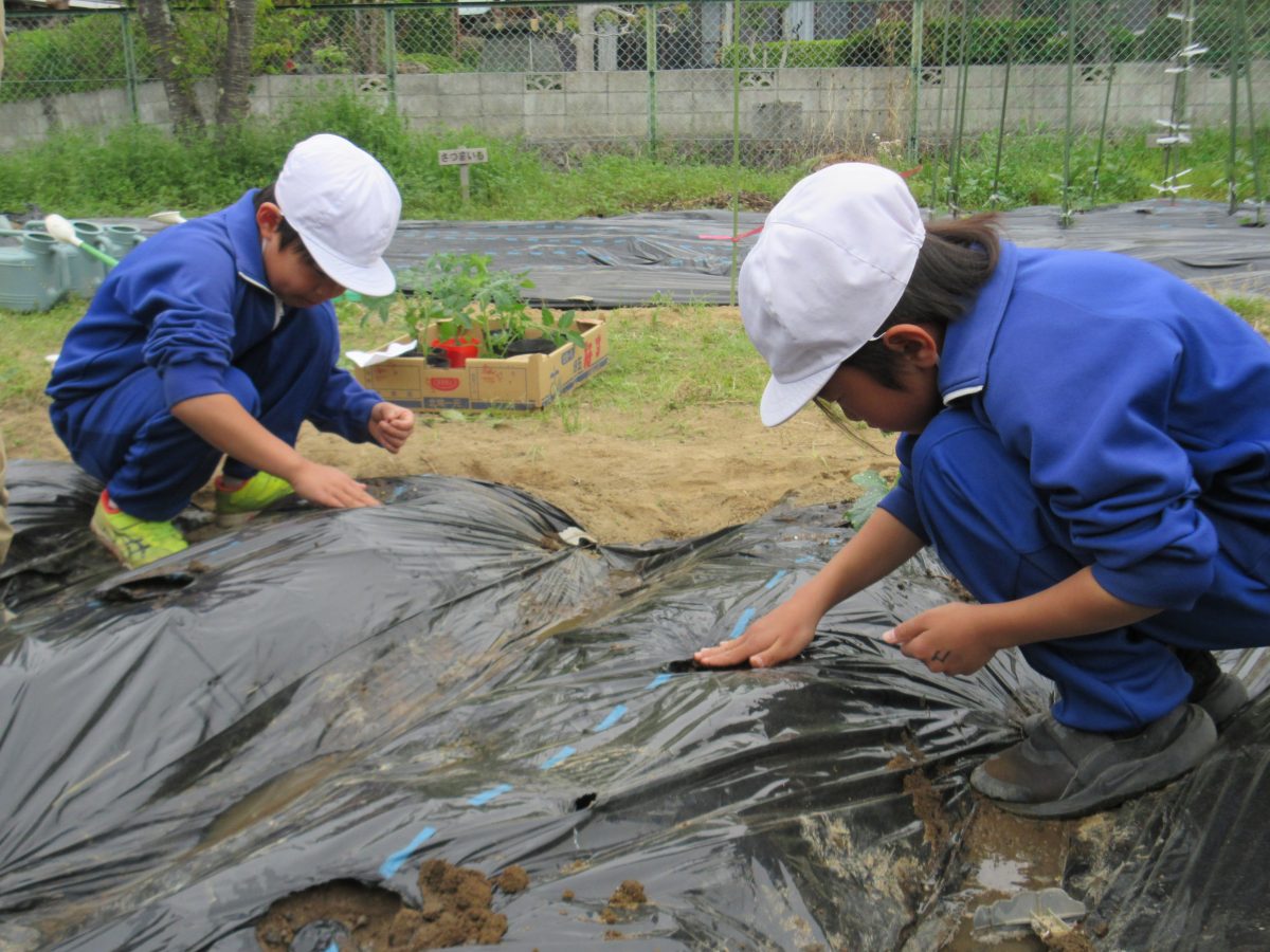 令和8年4月23日(木)、今日は1・2年生が農園に野菜の苗を植えました。どのように植えたらよいか、2年生がお手本を見せてくれました。1年生も2年生をまねして、優しくそっと土をかぶせていました。