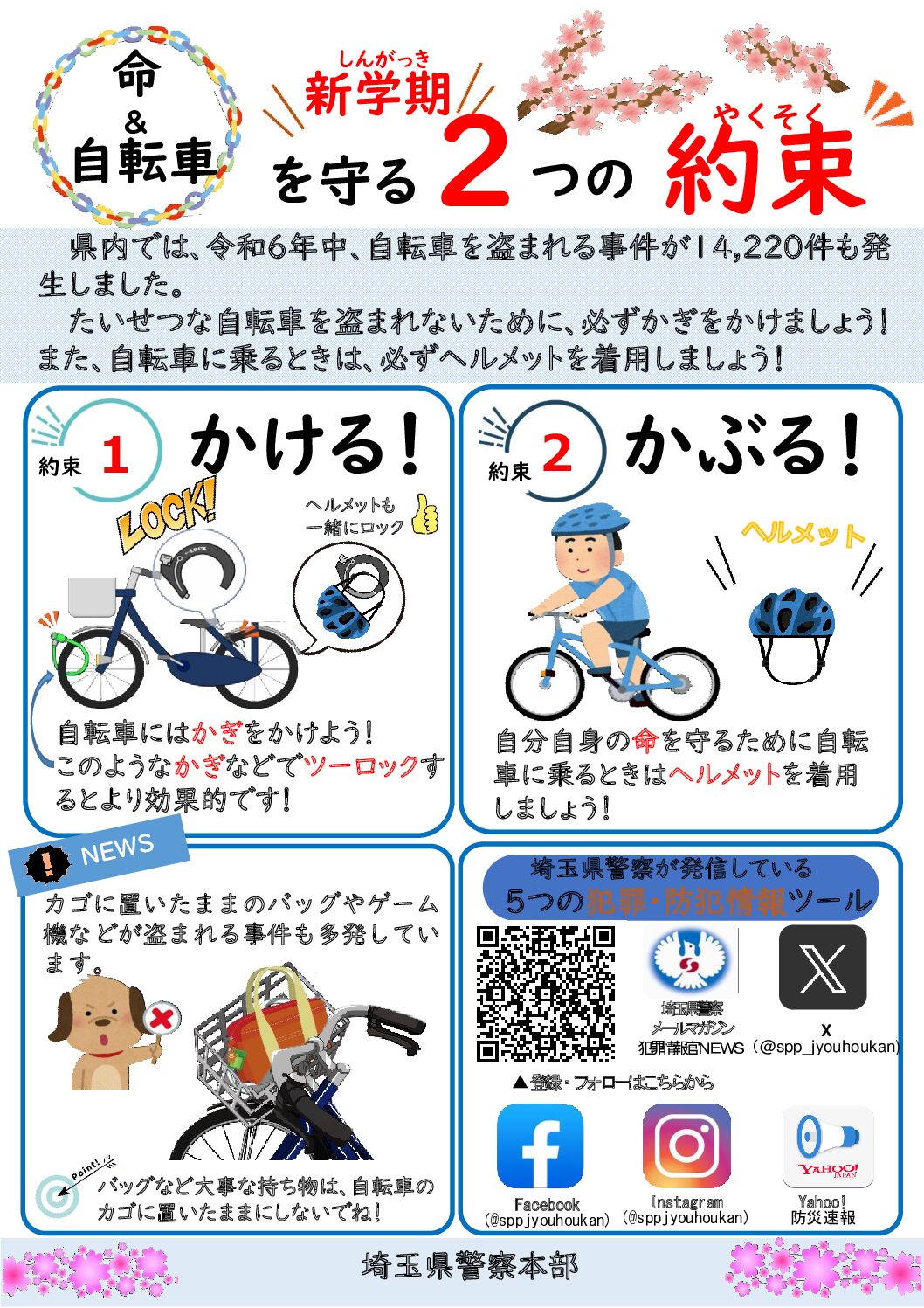 昨年令和6年、埼玉県で自転車窃盗事件が14220件ありました。被害状況を調べると、カギをかけないで盗まれるケースが多いです。短時間でも自転車にカギをかけるなど、防犯意識を高めていただくようよろしくお願いします。