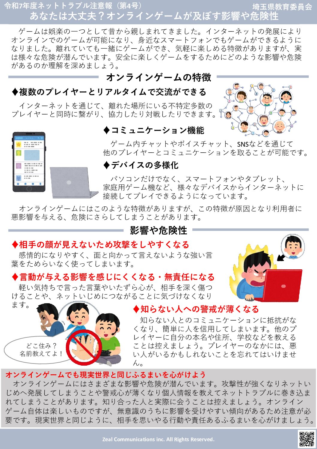 令和7年度ネットトラブル注意報第4号「あなたは大丈夫?オンラインゲームが及ぼす影響と危険性」