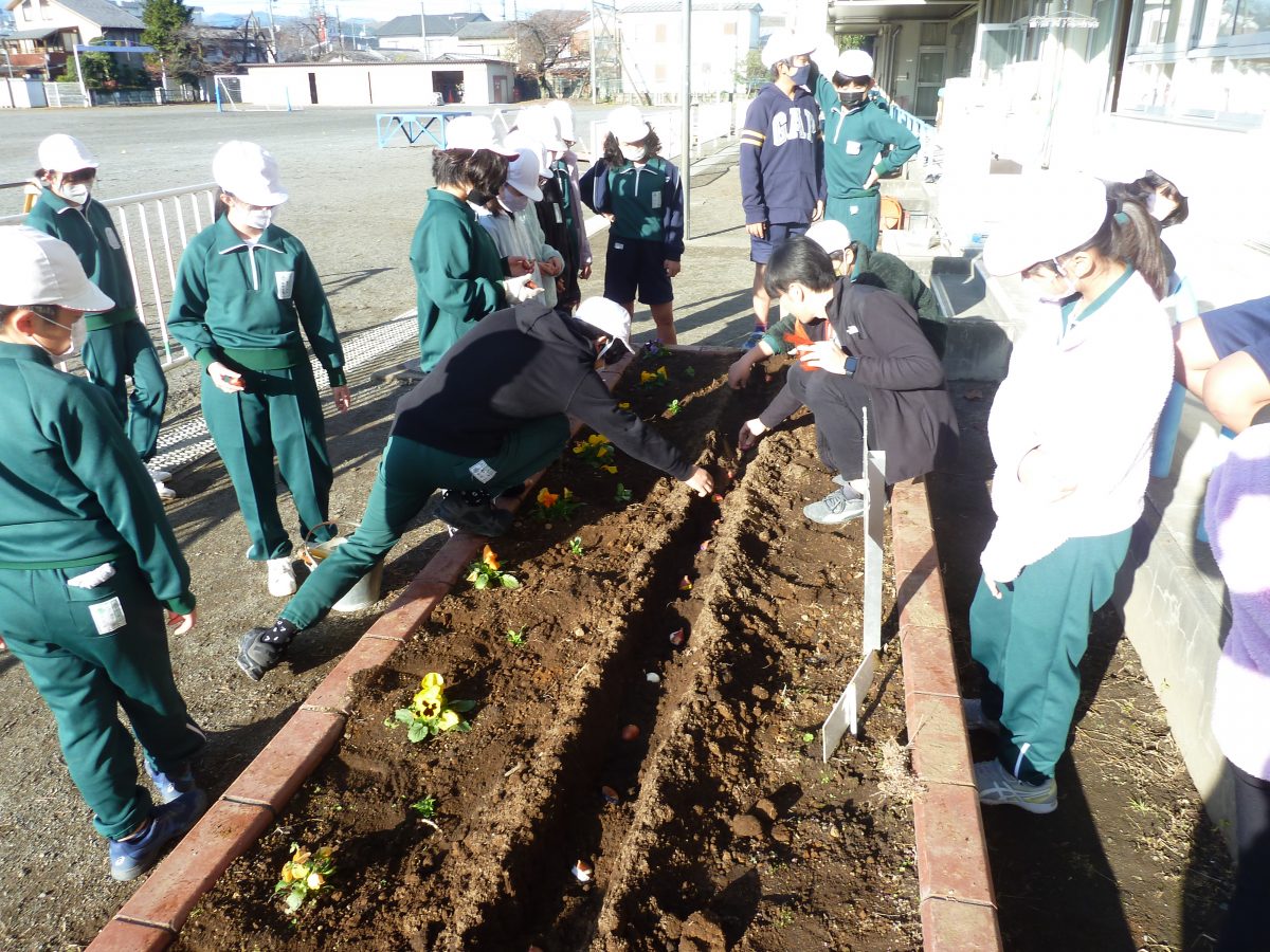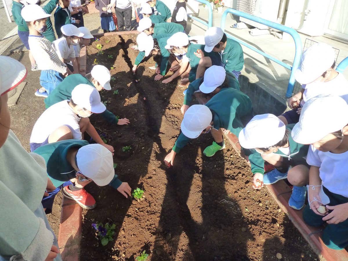 11月22日(火) 今朝、全校でチューリップとパンジーをそれぞれの花壇に植えました。ぷっくり大きなチューリップの球根とパンジーの苗を優しく手に取り植えました。来年の春、新しく南小に入ってくるかわいい1年生を迎える準備をしました。寒い冬を乗り越えて、元気に彩る花壇が、今から待ち遠しいです。