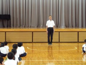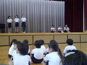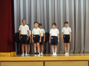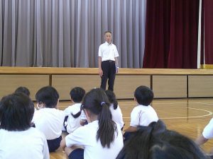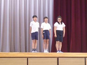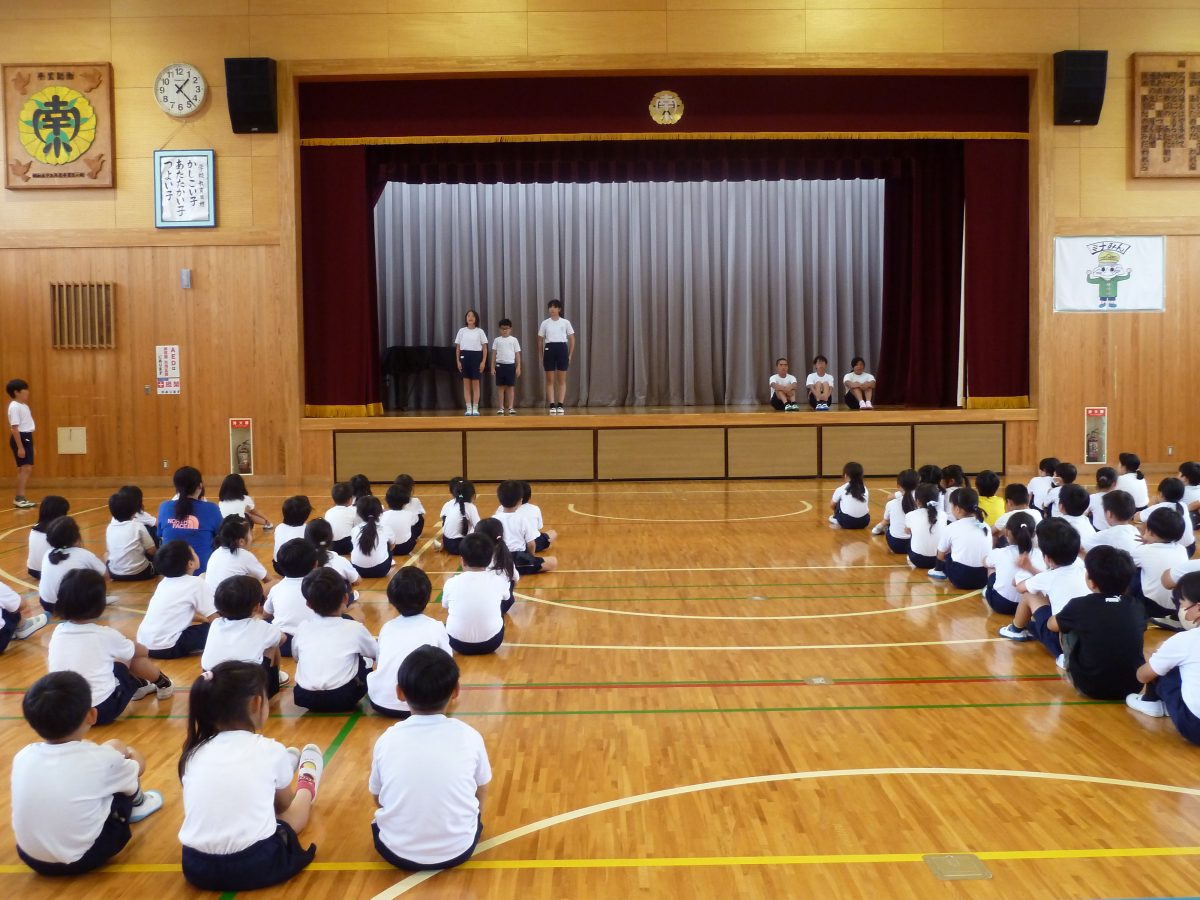 全校児童が体育館に集まり、各委員会の1学期の活動報告を行いました。