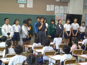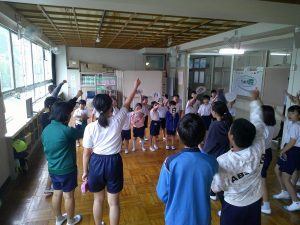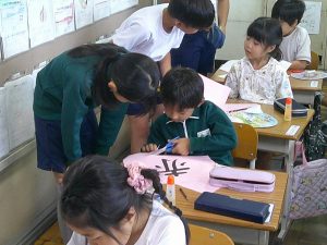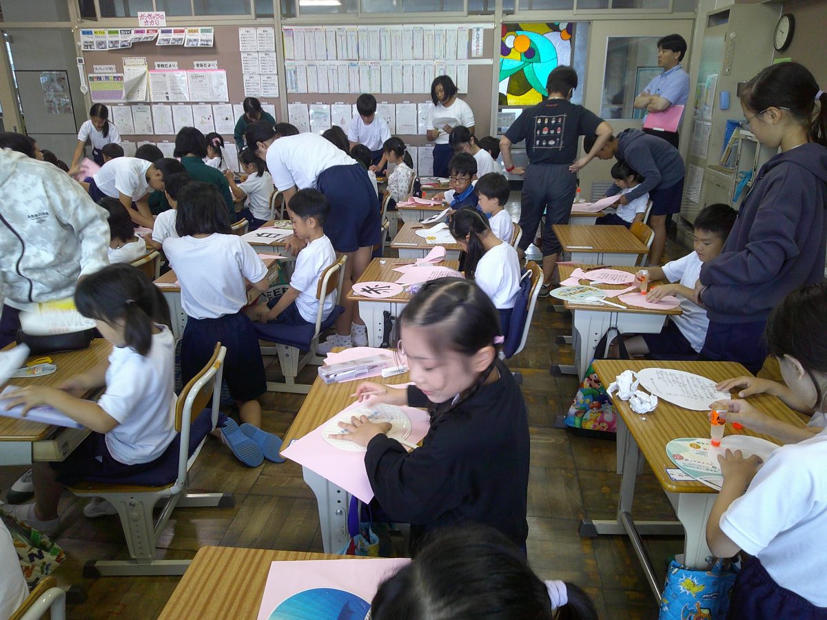 9月8日(金) 2校時に1年生と6年生で応援の練習を行いました。6年生が1年生の教室に出向き、応援で使用するうちわ作りのお手伝いをしました。その後、赤組と白組に分かれ応援歌の練習もしました。6年生が丁寧に説明をして、教えてくれました。応援歌もすぐに覚え、チャイムが鳴る前には大きな歌声が聞こえました。6年生、ありがとう!
