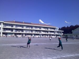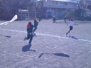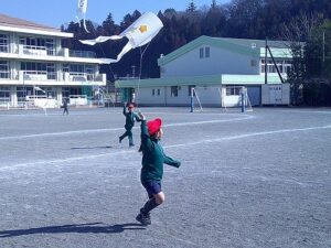 ペアになって、凧をあげる人と凧を持つ人に別れて行いました。天気はよかったものの風があまりなく、凧をあげる子は、校庭を元気よく走り回ってあげていました。