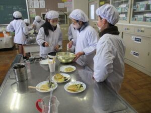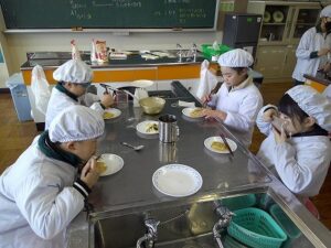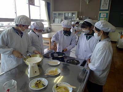 簡単な調理ですが、学校でガスを使って調理するのは初めてなので、緊張感を持って始めました。だんだん慣れてきて、グループの子達とわいわいしながら、楽しく安全に作ることができました。試食してみると「おいしい。」と言って、たくさん食べていた子もいました。