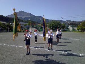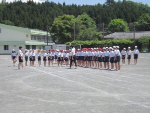 どの学年も校庭での練習が中心です。今朝は、全校練習で入場や開・閉会式、歌等の練習を行いました。