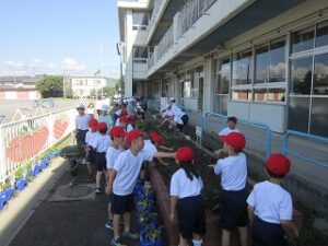 校庭や学級花壇の除草作業を行いました。クラスごとの学級花壇や、指示された校庭の除草作業をし、栽培環境委員会の児童が一輪車で抜いた草を回収しました。