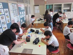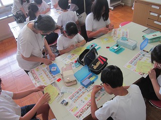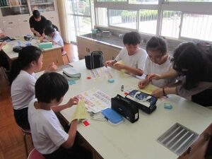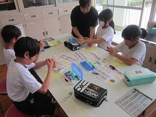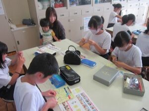 裁縫の経験は、ほとんどの子が初めてです。裁縫道具箱から針と糸、針さしを出し、まずは、玉止めに挑戦しました。動画を見てやり方を確認してから、実際にやってみました。すぐにやり方がわかりコツをつかんだ子もいれば、悪戦苦闘する子もいました。何回か行い、次に、玉結びを行いました。玉止めと同じように動画を見てから、挑戦しました。玉結びの方が苦戦している子が多かったようです。1時間だけでは足りないようなので、次回も玉止め・玉結びを行うようです。