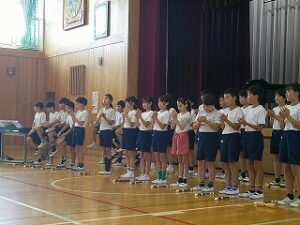 最後に、全校児童で今月の歌「しあわせなら手をたたこう」を歌詞の動作を入れて歌いました。動きを入れながら歌ったので、全校が一つになったような雰囲気になりました。