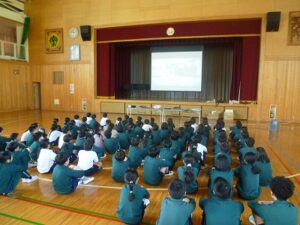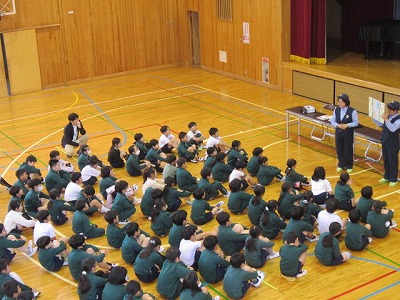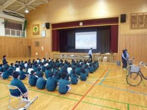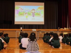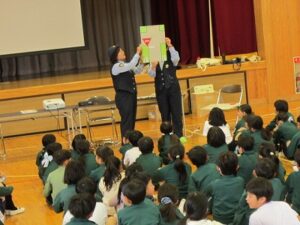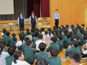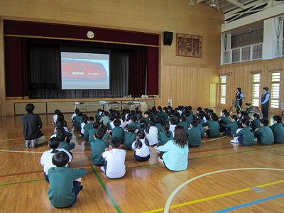 5月7日(水) 1・2年生と3~5年生が交通安全教室を体育館で実施しました。