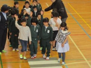秩父市役所市民生活課の交通指導員3名の方々においでいただき、1・2年生は2校時に道路の歩き方や横断歩道の渡り方を教えていただき、3~5年生は3校時に自転車の安全な乗り方について教えていただきました。