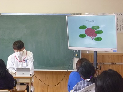 薬物を使うと脳がどうなってしまうのか、体にはどんな影響があるのか等について、パワーポイントを見たり、話を聞いたりしました。