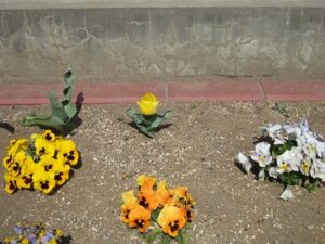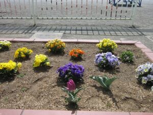 3月16日(月) ふと、学校花壇に目をやると、昨年の11月中旬に植えたチュ-リップが二輪(紫色と黄色)咲いていました。他にも、もうすぐ咲きそうなチューリップがいくつかありました。