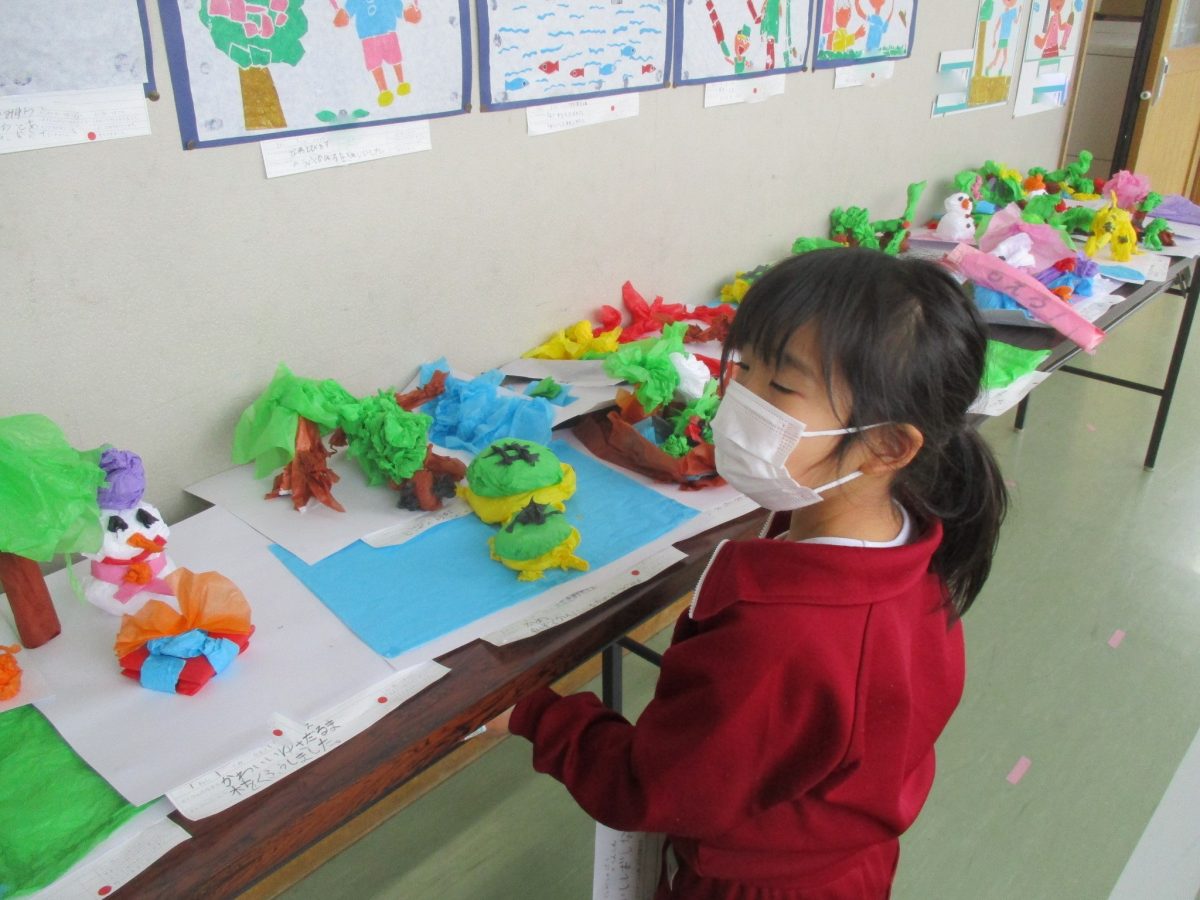 1年生の図工では、くしゃくしゃしたら大へんしんを作りました。花紙などくしゃくしゃした紙からつくりたいものを立体に表しました。
