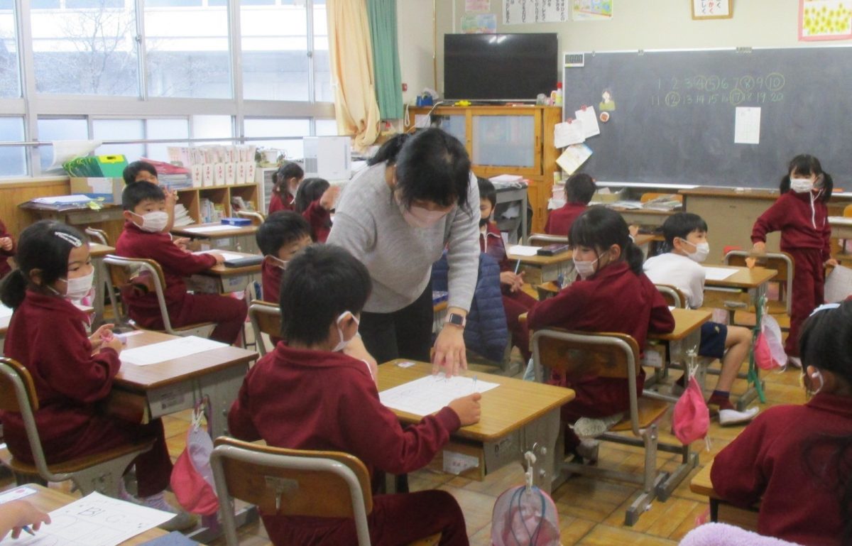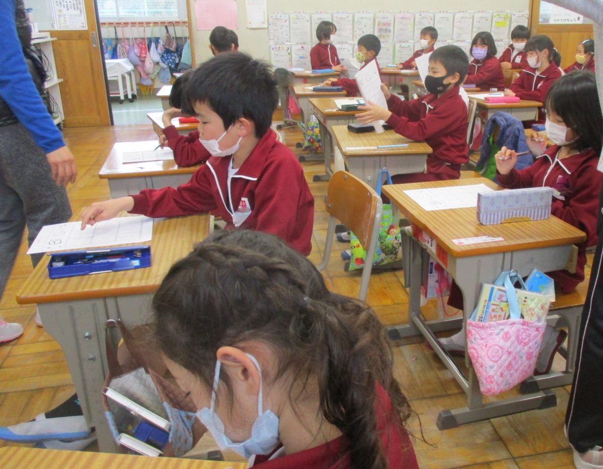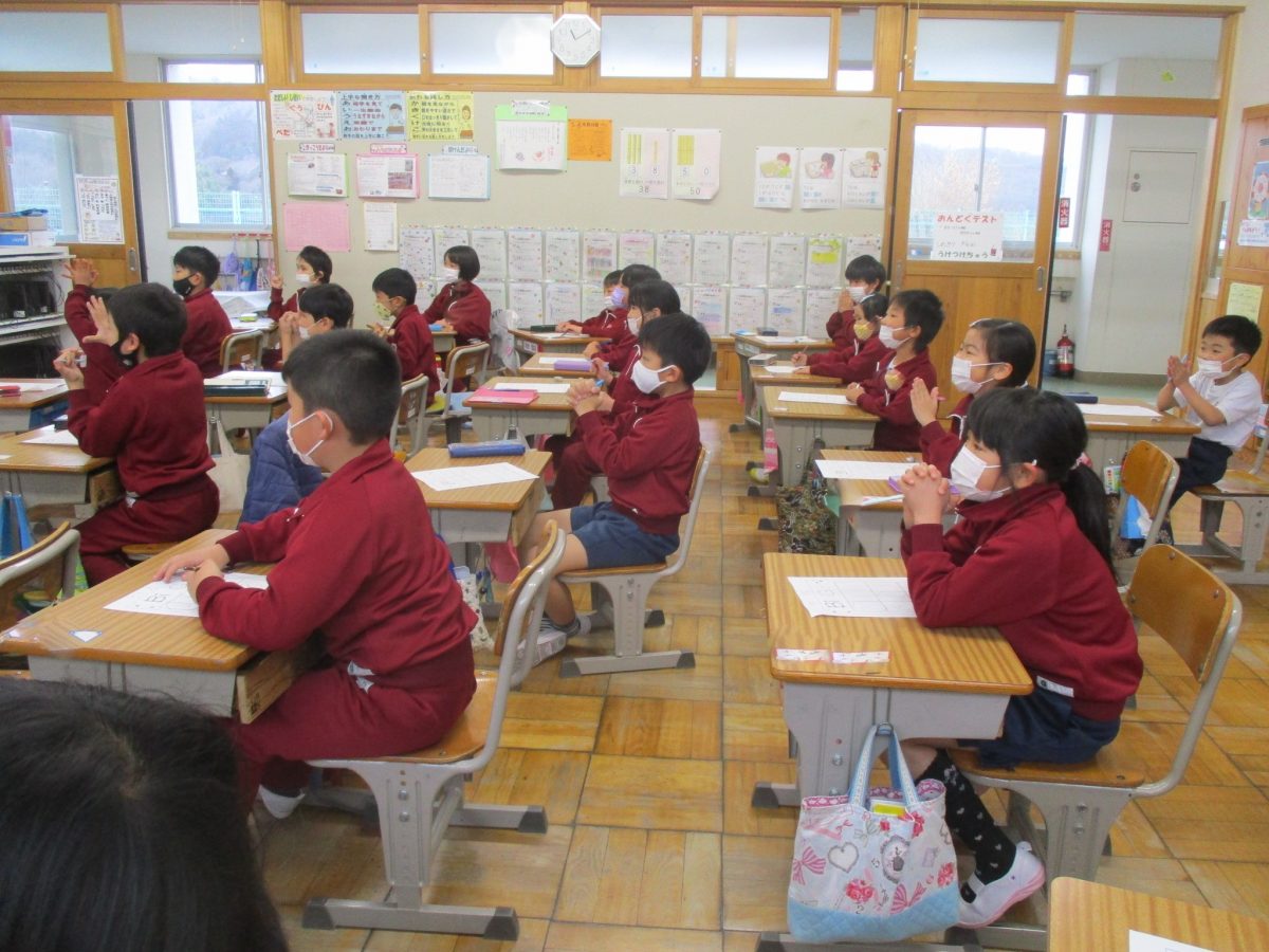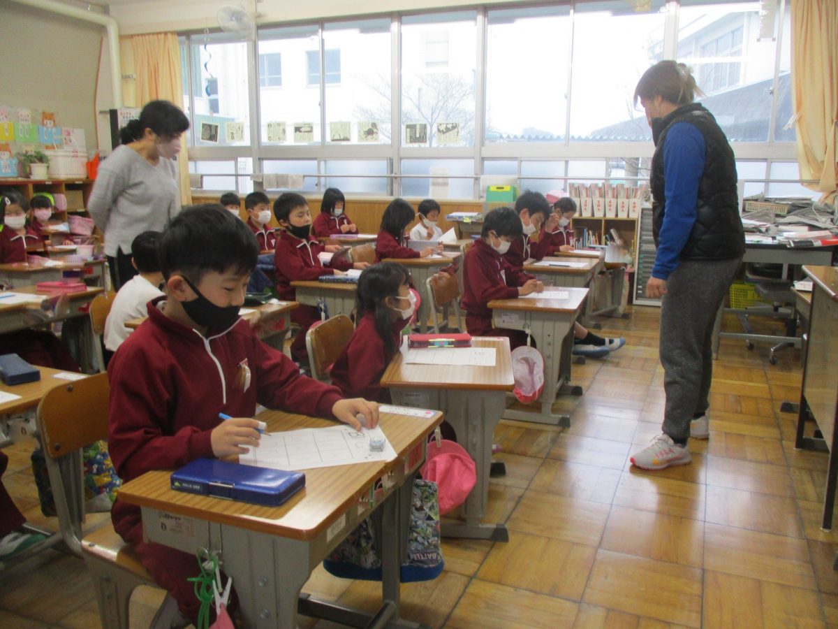 1、2年生は、年間に10時間程度、ALTの先生と英語に親しむ授業を行っています。今日は、英語のヒントで動物をあてるゲームや、英語を数で答えていくビンゴゲームを行い、親しみました。楽しい雰囲気で、英語で数や動物を答えていました。