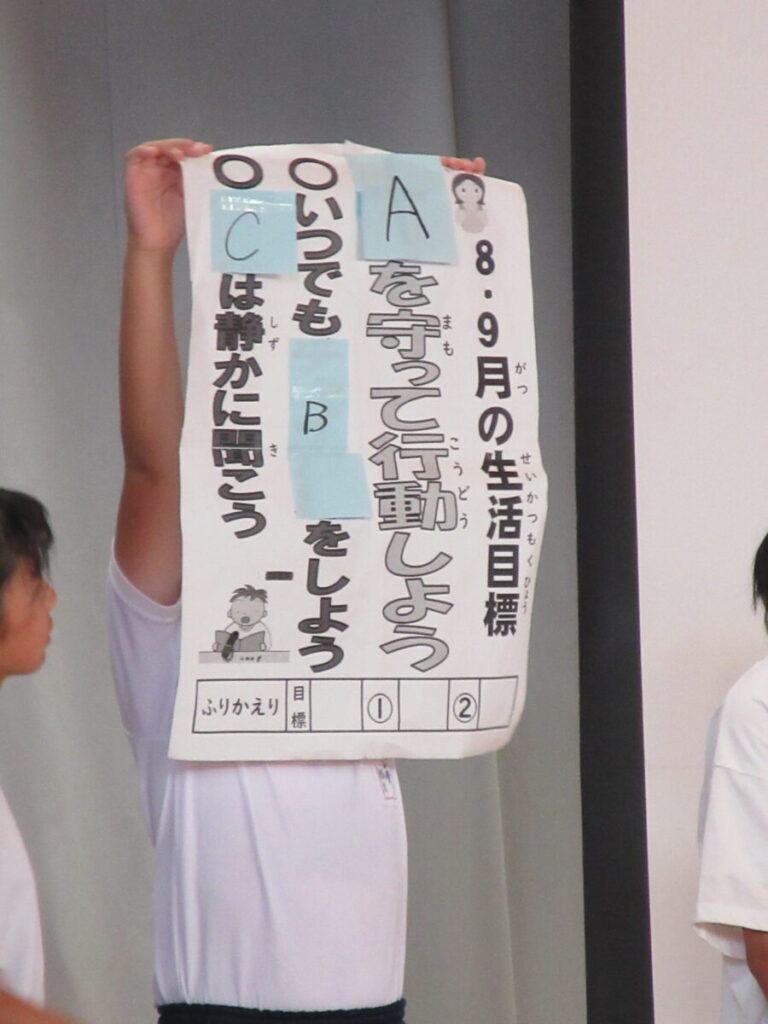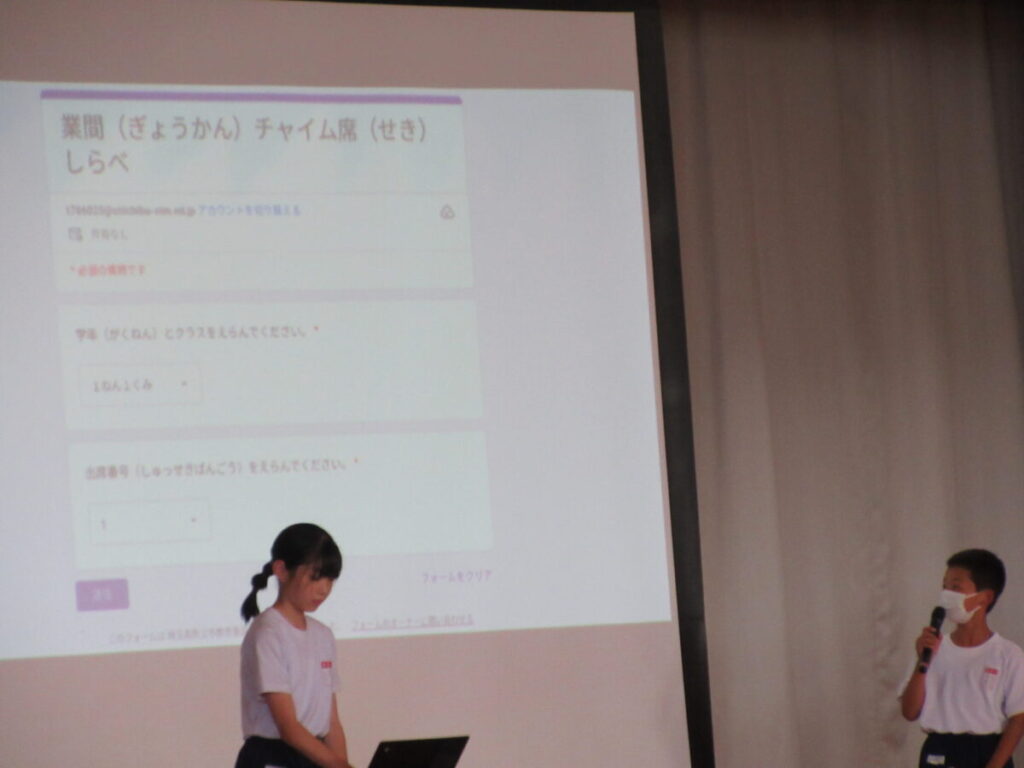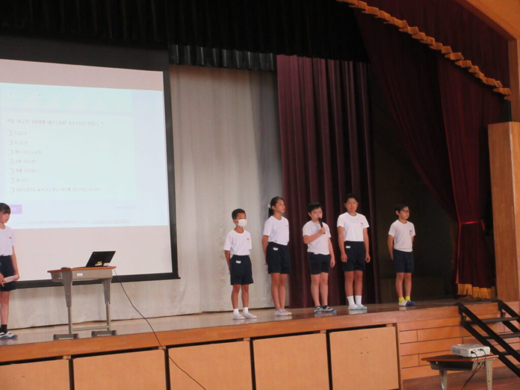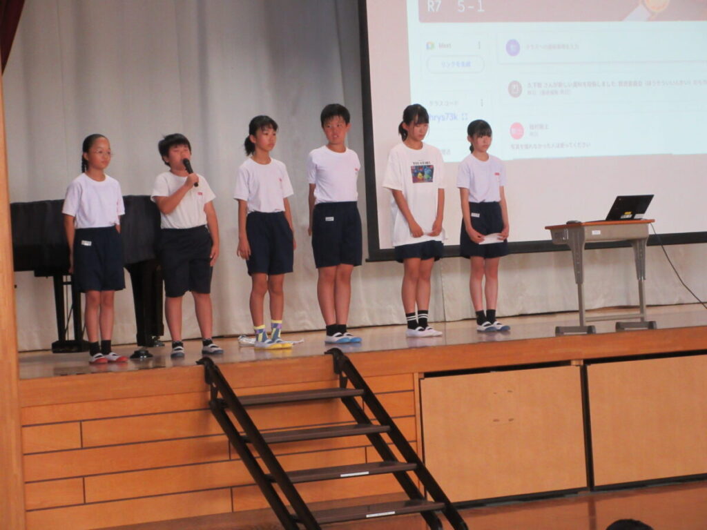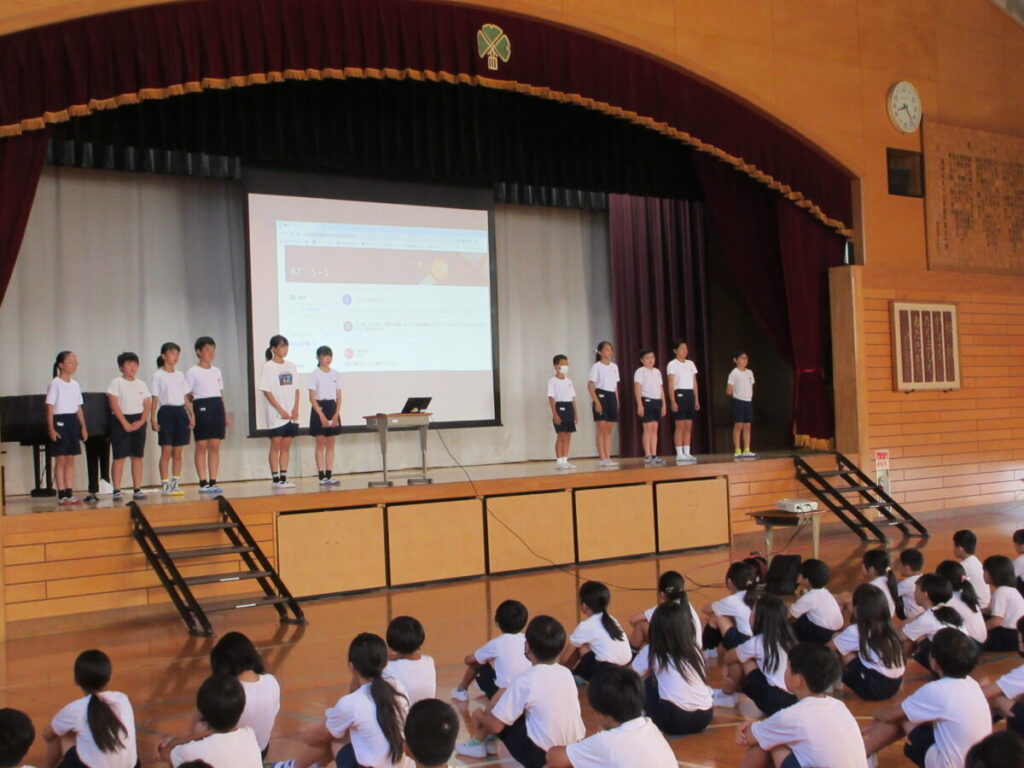 本日の業前活動は児童集会でした。放送委員会の皆さんが、生活目標の発表と達成のための取り組みを考えてくれました。今月の生活目標は、『時間を守って行動しよう』①いつでもチャイム席をしよう。②放送は静かに聞く。です。達成のために、①では、始業のチャイム前に着席し、タブレットのフォームに名前を入力する。②では、放送の中でキーワードを発表し、聞き取ったキーワードをタブレットのフォームに入力する。というキャンペーンを行います。みんなで取り組んでみましょう!